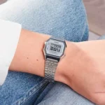 ظاهر رترو دیجیتال با بند فلزی براق نقرهای، ترکیب کلاسیک و مدرن را ایجاد میکند.