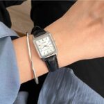یک ساعت کلاسیک، ظریف و شیک با الهام از طراحی «Tank» که برای خانمها و کسانی که ابعاد کوچک و سبک را دوست دارند، گزینهای عالی است. طراحی مینیمال، بند چرمی مشکی و قاب نقرهای باعث شده این مدل هم برای تیپ رسمی مناسب باشد و هم برای استفاده روزمره.