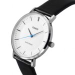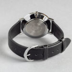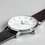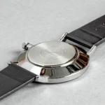 قاب براق استیل نقرهای که تضاد ملایمی با بند چرمی مشکی ایجاد کرده است؛ ترکیب کلاسیک و مناسب برای تیپهای متنوع.